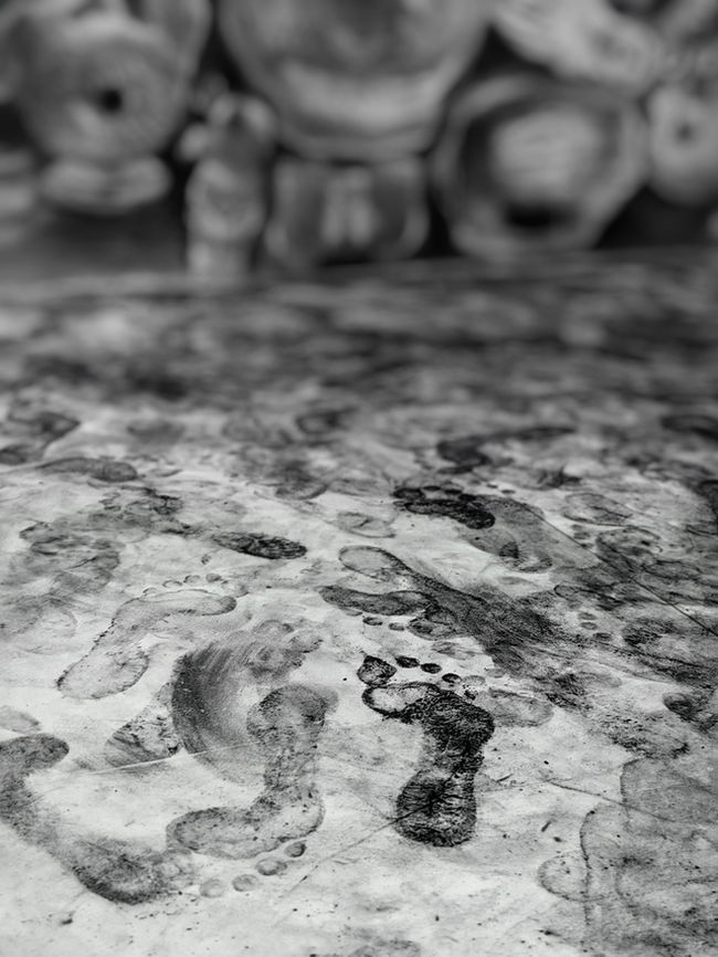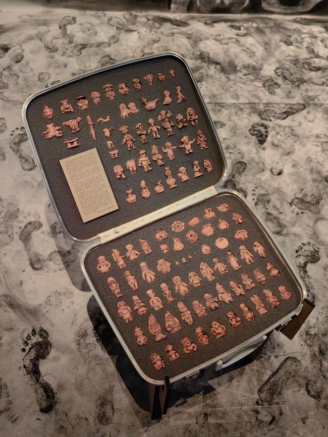Departing from an official inventory of archaeological objects classified as false, pieces produced by La Pila's artisans and dismissed as fakes by institutional authority, this project examines what it means for a museum to classify knowledge as illegitimate. A briefcase holds dozens of miniature ceramic figures. Behind it, a charcoal collage reproduces the same objects in a register of dust and erasure. On the floor, charcoal footprints trace the steps of those mocarros who shaped a past and turned it into the present.